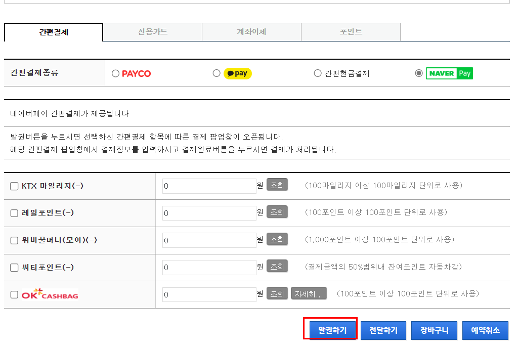 이렇게 결제종류를 선택 하여 발권하기를 누르면 결제가 되고 발권이 완료됩니다.