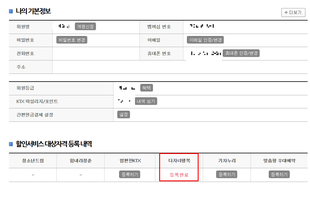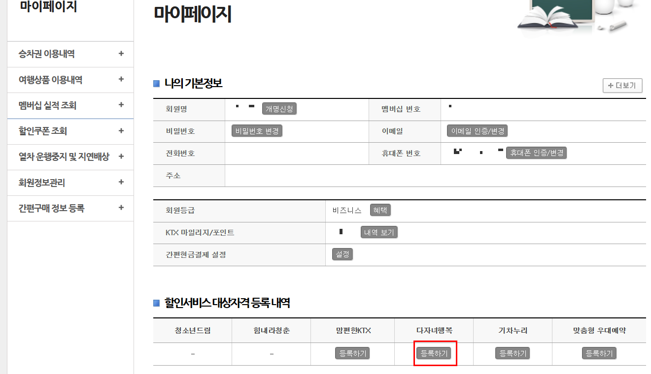 '마이페이지'에서 중간에 있는 '할인서비스대상자격 등록 내역' 중 '다자녀 행복' 등록하기를 클릭합니다.