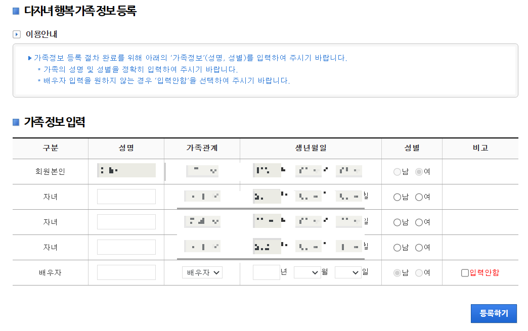 직접 등록하기 말고 동의한 후 주민등록번호를 인증하면 이렇게 다자녀 행복 가족 정보 등록이 나타납니다.