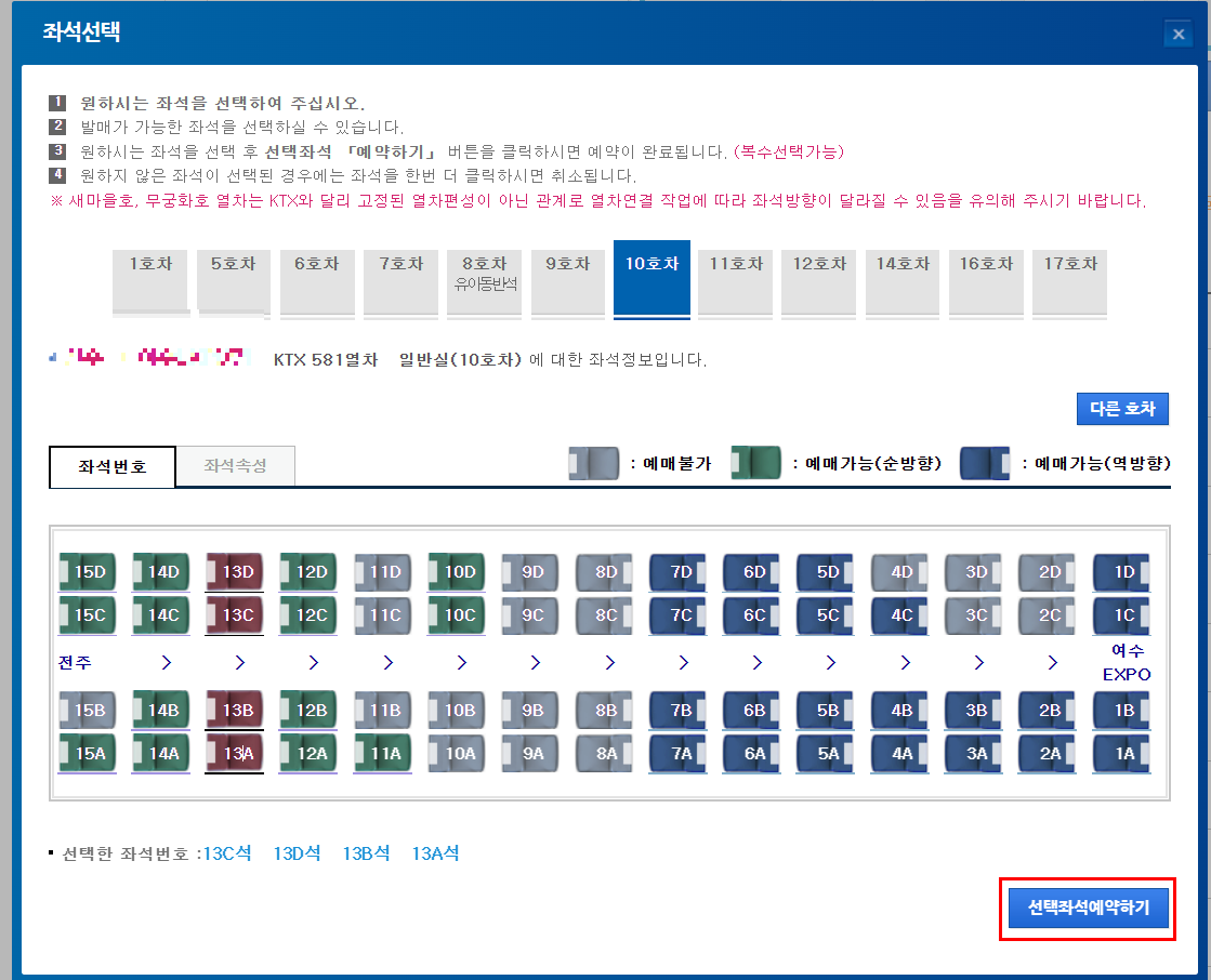 좌석을 선택한 후 '선택좌석 예약하기'를 클릭합니다.