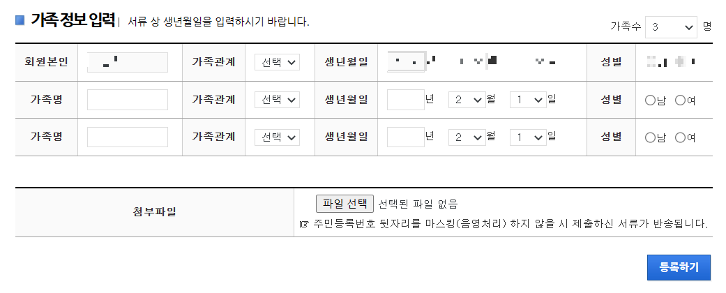 로그인 한 회원의 세대원으로만 있는 가족구성원이 표기되기 때문에 세대원에 포함되어 있지 않은 구성원이 있다면 가족관계 증명서를 첨부하여 인증받을 수 있는 '직접 등록하기'도 있습니다.