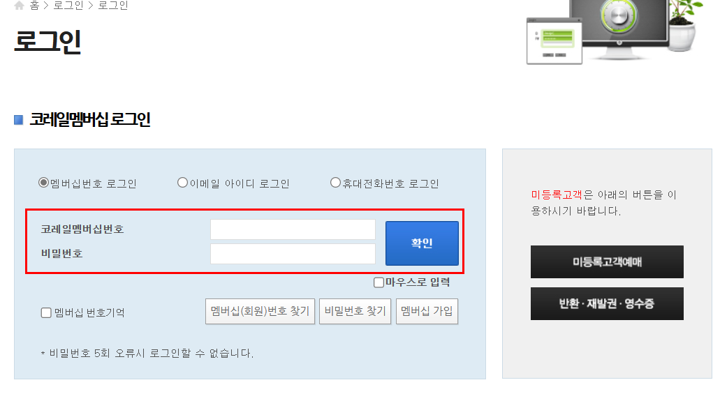 저 같은 경우 코레일 멤버십 번호를 잊어 이메일, 휴대전화로 로그인해보려고 했지만 이메일, 휴대전화 인증이 되어 있지 않다고 하여 '멤버십 번호 찾기'로 찾으니 휴대폰인증으로 쉽게 찾을 수 있었습니다.