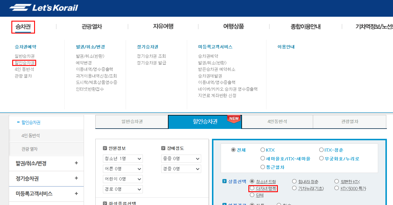상단 승차권> 할인승차권으로 들어가셔서 다자녀 행복을 클릭하여 예매하여야 합니다.