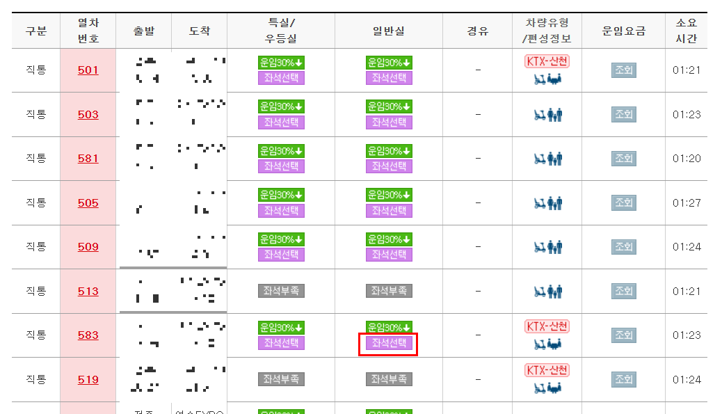 이렇게 열차시간표가 뜨면 좌석선택을 클릭합니다.