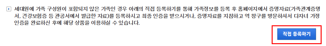 로그인 한 회원의 세대원으로만 있는 가족구성원이 표기되기 때문에 세대원에 포함되어 있지 않은 구성원이 있다면 가족관계 증명서를 첨부하여 인증받을 수 있는 '직접 등록하기'도 있습니다.