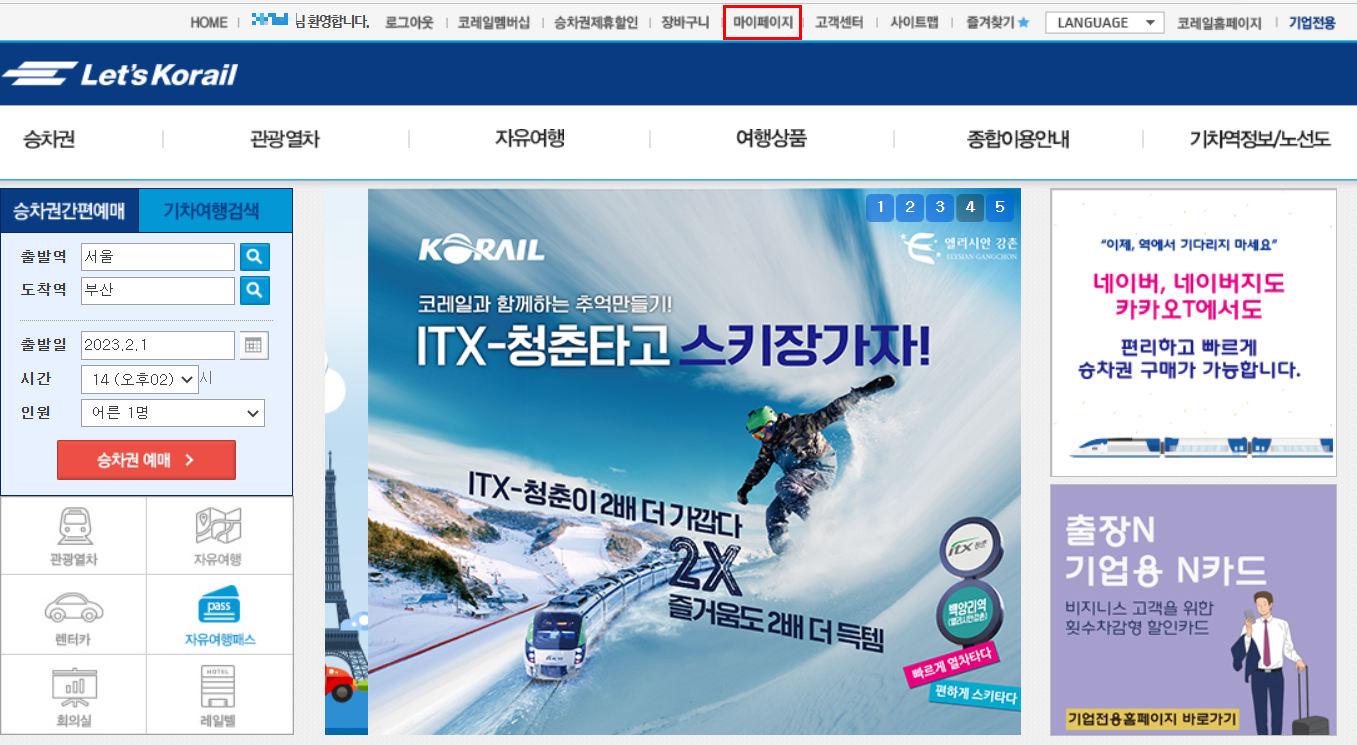 '로그인'이 되었다면 상단의 '마이페이지'를 클릭합니다.
