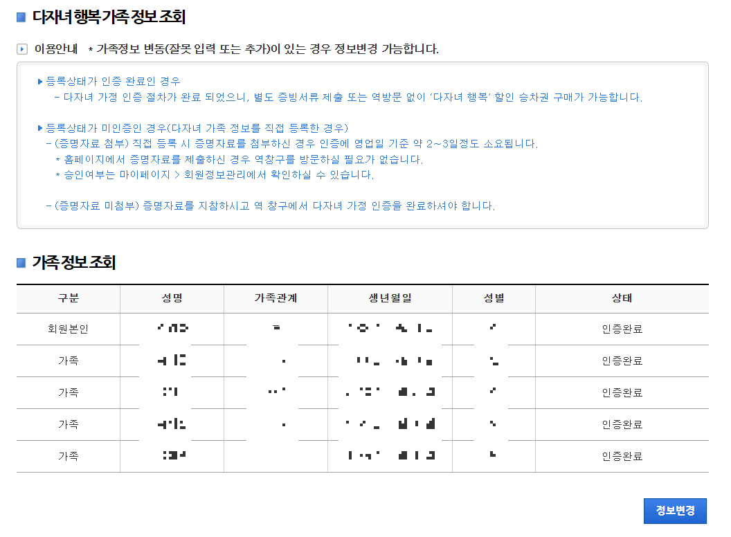 -등록된 가족 이외에 다른 사람이 이용하는 경우 할인금액 회수 및 추가로 부가운임을 수수하며, 할인승차권을 다른 사람에게 제공한 회원은 할인자격이 정지됩니다.