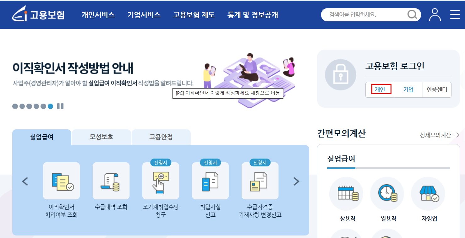 ①고용보험홈페이지로 접속하여 로그인을 합니다.