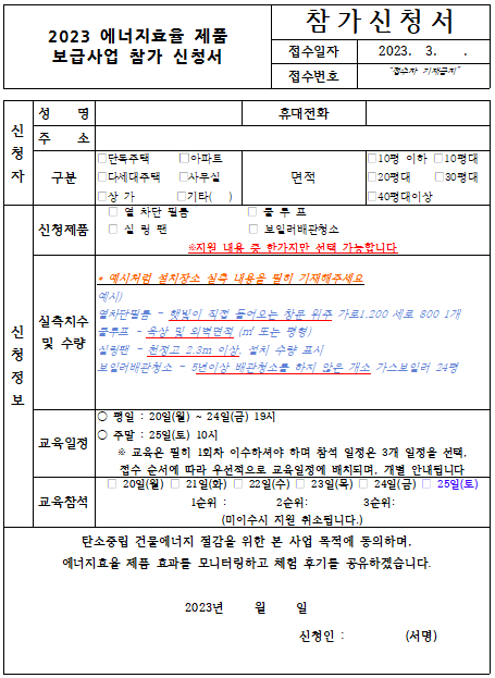 전주시에너지센터 홈페이지 > 참여마당 > 건물에너지 게시판 > 2023년 에너지 효율제품 보급지원사업 지원개소 모집 게시글 > 에너지효율제품 보급지원사업 신청서 다운로드 > 작성 후 이메일 접수 및 팩스 접수