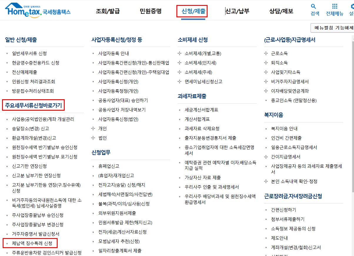 국세청 홈택스에 로그인하셔서 신청/제출 > 주요 세무서류신청바로가기 > 체납액 징수특례 신청을 클릭합니다.