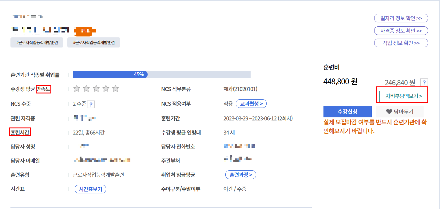 원하는 훈련과정을 클릭하여 들어가면 회차에 따른 훈련기간이나 자비부담액, 수강생 평균 만족도, 훈련시간, 시간표까지 자세히 확인하고 수강신청할 수 있습니다.