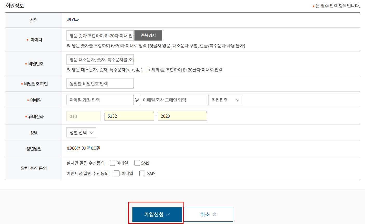 약관동의, 본인인증, 정보입력이 완료되면 회원가입이 완료됩니다.