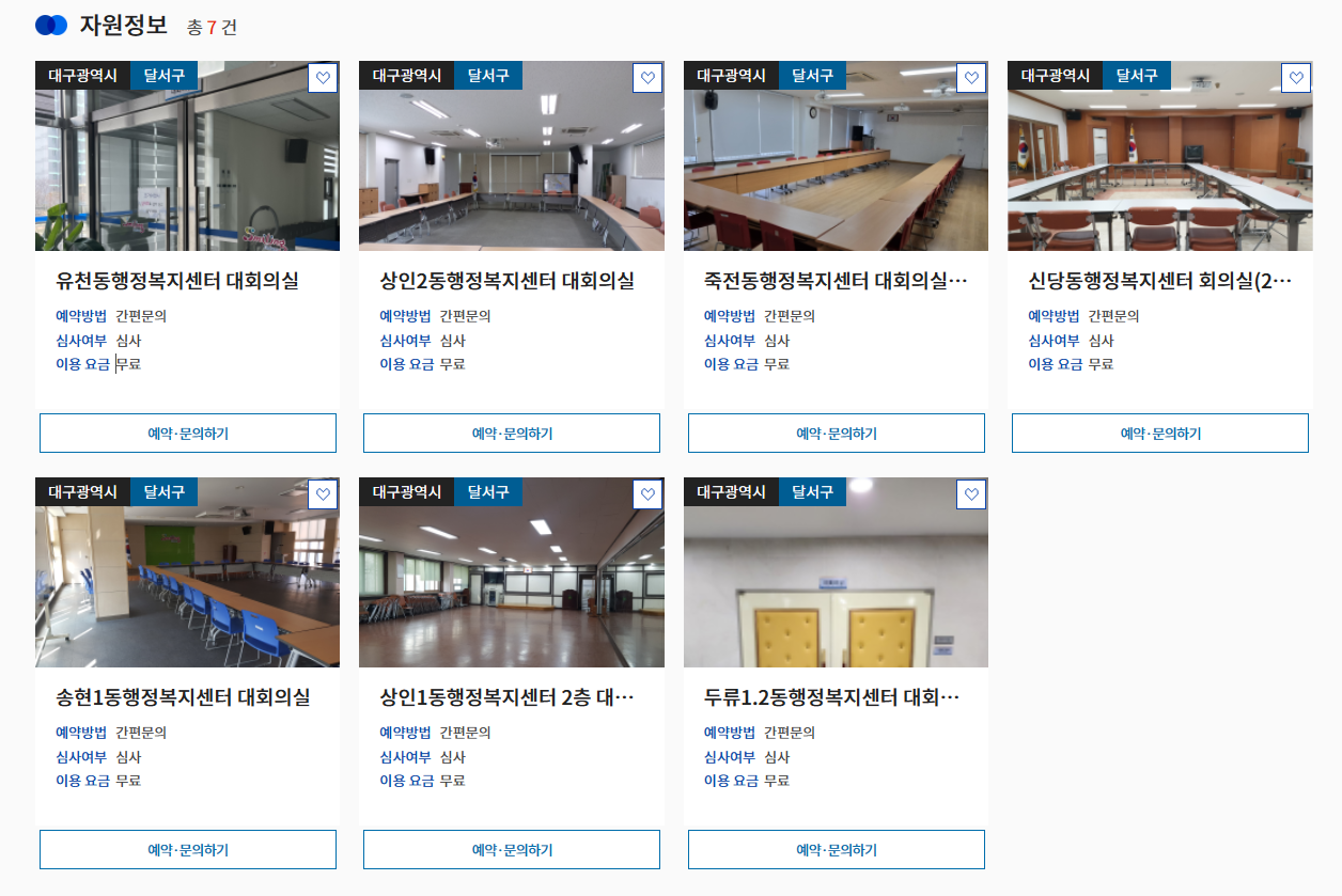 회의실, 강의실, 소강당, 문화체육시설 등 여러종류의 공유서비스를 유료, 무료로 이용가능합니다.