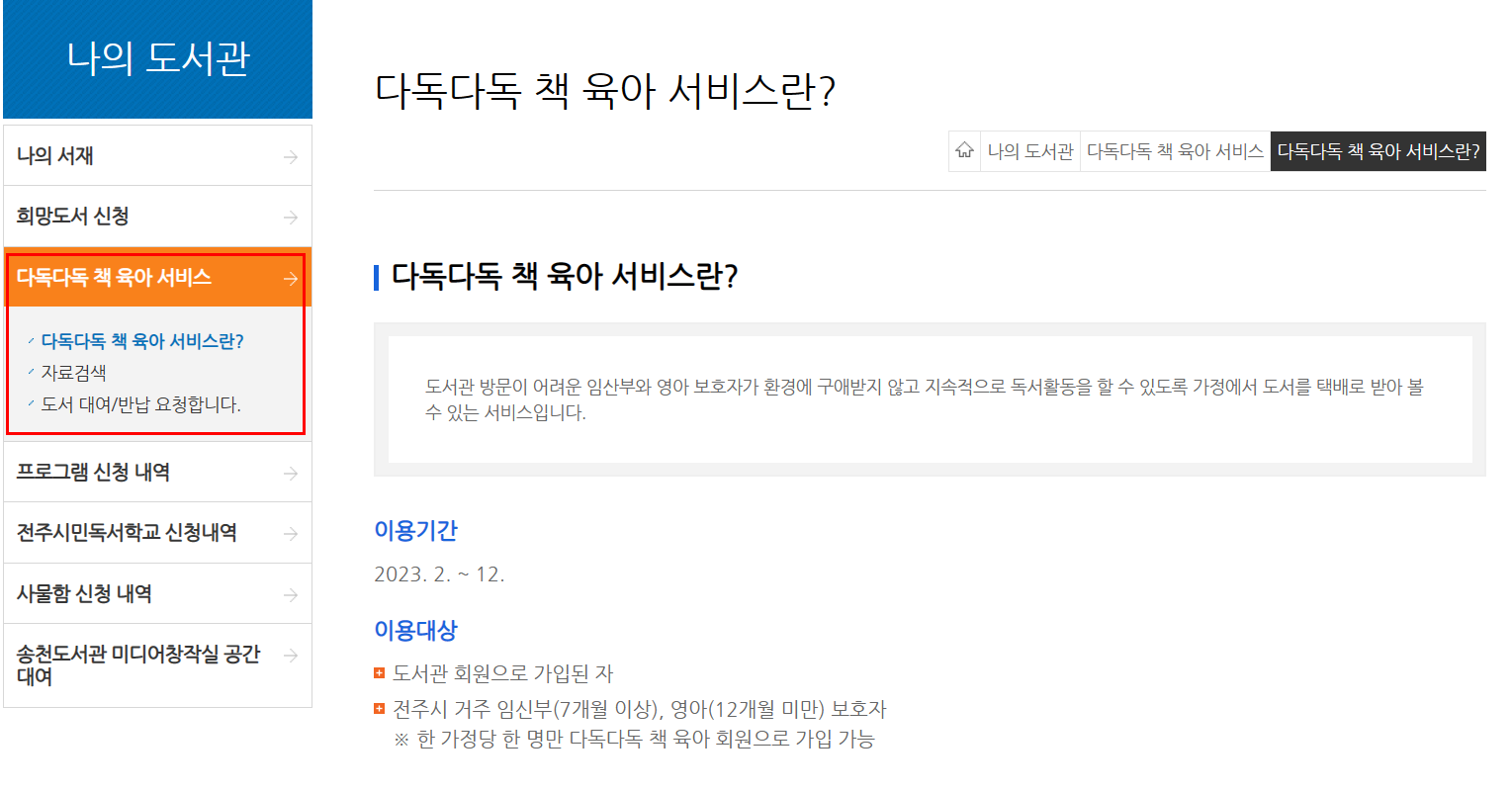 도서관 방문이 어려운 임산부와 영아 보호자가 환경에 구애받지 않고 지속적으로 독서활동을 할 수 있도록 가정에서 택배로 도서를 받아볼 수 있는 서비스입니다.